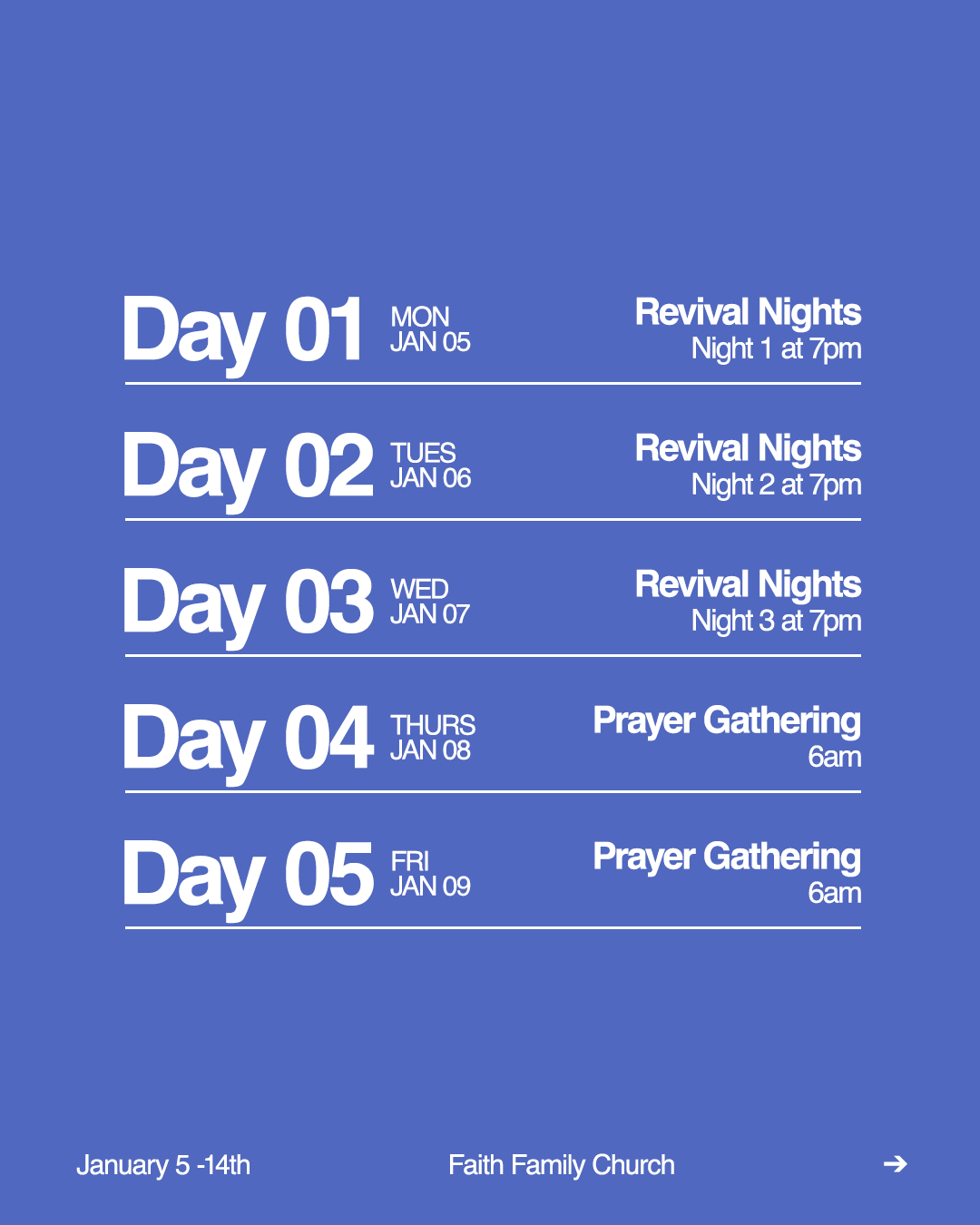 When Revival Nights wrap up, we’ll continue our Days of Power & Prayer by gathering at our Baytown Campus at 6 AM on weekdays, 9 AM on Saturday, January 10, and then coming together again on Wednesday, January 14 at 7 PM for a Night of Worship as we thank God for all He has done and all He will continue to do.