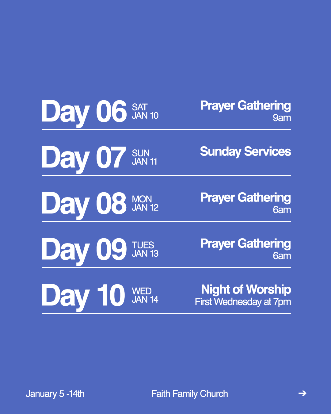 These days are set aside for intentional worship, prayer, and time in God’s Word as a church family. It’s a chance to silence distractions, reset our hearts, and be renewed from the inside out as we celebrate God’s goodness and prepare for all He wants to do in our lives.